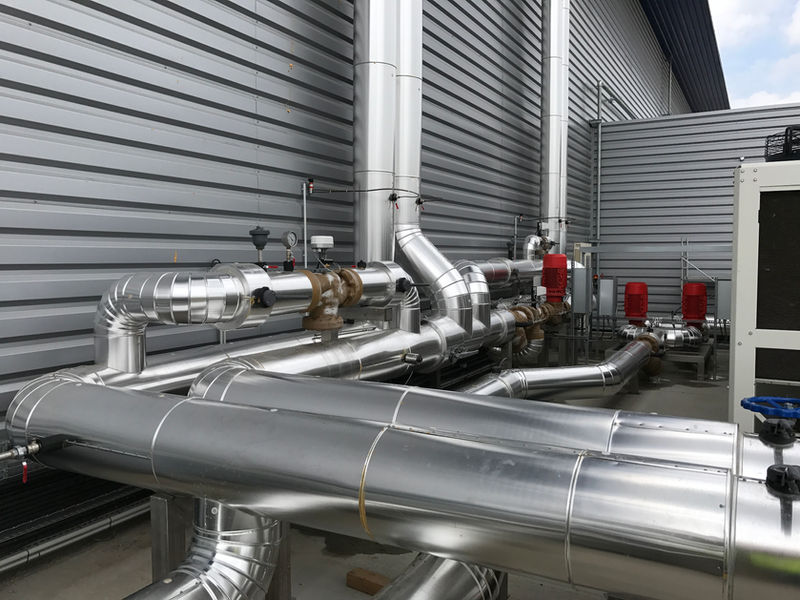 Nous avons donc accompagné la société AXIMA REFRIGERATION et réalisé la fourniture et la pose de l'ensemble de l'isolation de type STYROFOAM avec pare vapeur et finition en tôle ISOXAL sur les tuyauteries MEG de leur nouvelle installation frigorifique.